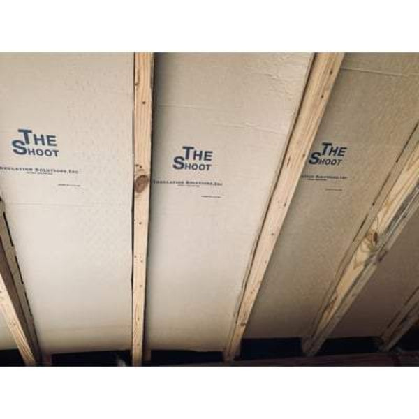 The Shoot is a patented insulation backer used as a substrate for spray foam and blown insulation in open framed areas of new construction applications for residential and commercial buildings. Pre-creased staple flanges allow for easy installation in most common wall cavities. The Shoot is ideal for knee walls, common walls and any open cavity without a spray template.