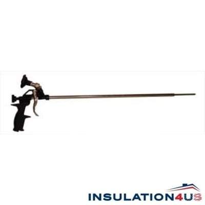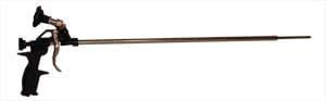 Spray gun designed for the application of single component polyurethane foam, packaged in pressurized cans. The gun enables the user to adjust the product flow, thereby reducing waste. The gun is hermetically sealed, which prevents hardening of the product in the gun. Professional, metal, reusable gun for the price of a plastic gun.